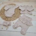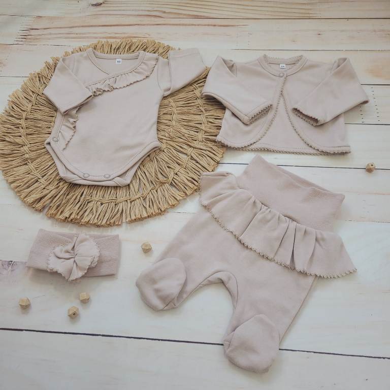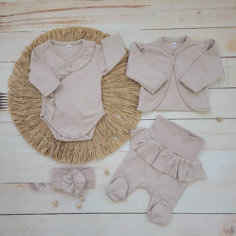 Szett tartalma: 1 db lábfejes nadrág, 1 db lapozós hosszú ujjú body, 1 db fejpánt, 1 db boleró