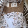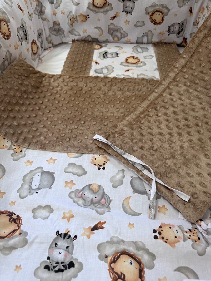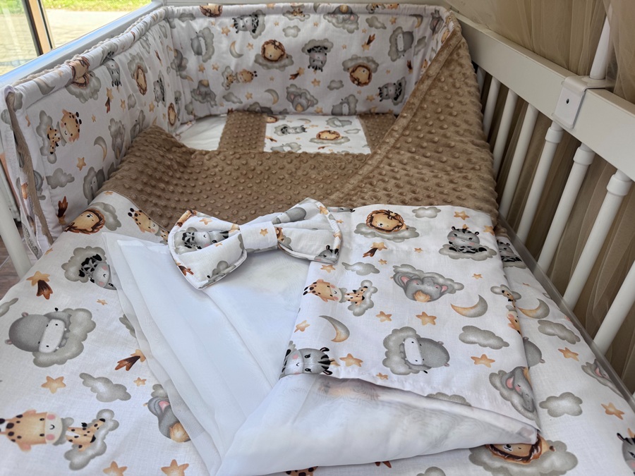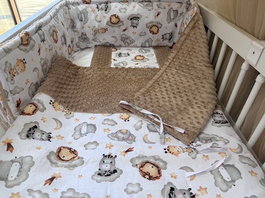 Négy részes (takaró + párna + fejvédő + baldachin) színes vidám mintákkal készült babaágynemű szett, az anyukák és a kisbabák legnagyobb örömére. A fejvédő óvja a már fejét emelgetni tudó babát az ággyal való ütközéstől, mely megkötők segítségével erősíthető a kiságyhoz.