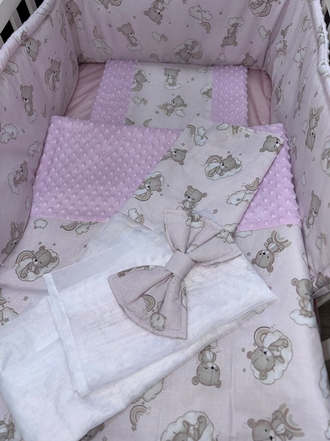 Négy részes (takaró + párna + fejvédő + baldachin) színes vidám mintákkal készült babaágynemű szett, az anyukák és a kisbabák legnagyobb örömére. A fejvédő óvja a már fejét emelgetni tudó babát az ággyal való ütközéstől, mely megkötők segítségével erősíthető a kiságyhoz.