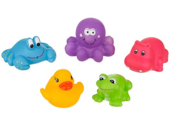 Szett tartalma: 5 db fürdőjáték (kacsa, béka, víziló, rák, polip)