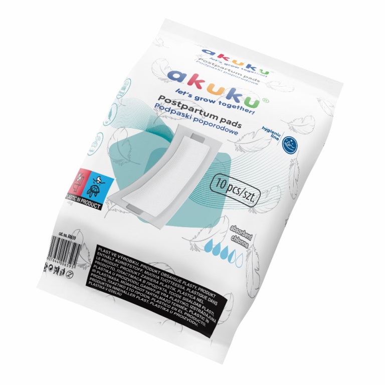 Az „Akuku” nedvszívó szülés utáni betétek a szülés utáni időszakban biztosítanak minden helyzetben kényelmet és nyugalmat. A finom és szuper puha belső réteg megakadályozza a leragadást és a bőrirritációt. A felső réteg lehetővé teszi a levegő áramlását, ezzel biztosítva a frissesség érzését. A párna belsejében található szuperabszorbens pedig gyorsan megköti a nedvességet és semlegesíti a kellemetlen szagokat. A széles ragasztócsík a helyén tartja a betétet. Használata hálós és eldobható bugyival ajánlott!