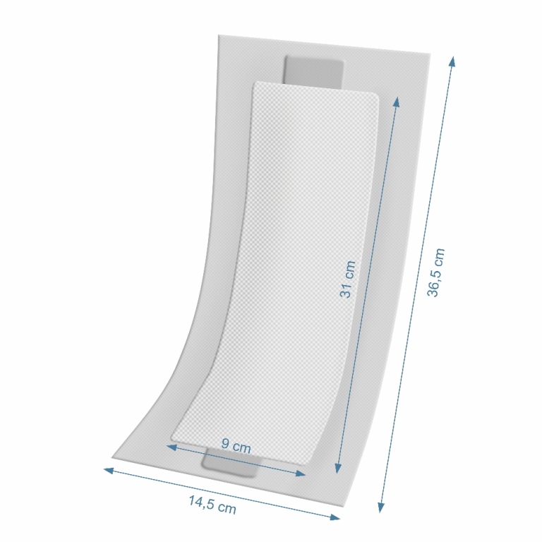 Egészségügyi betét mérete: szélessége 14,5 cm, hossza 36,5 cm, vastagsága 0,5 cm