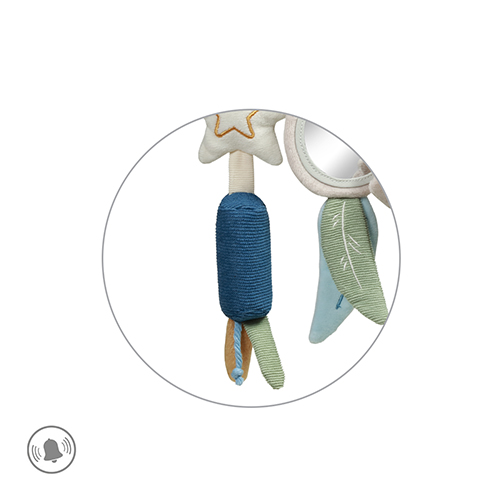 A NATURE babakocsi és autósülés plüss egy szenzoros játék, amely segít serkenteni a tapintást és a látást, valamint fejleszti a gyermek motoros készségeit. Rögzítse babakocsihoz, bölcsőhöz vagy autósüléshez, hogy szórakoztassa kicsijét séták és utazások során! A kellemes tapintású anyaggal borított medálra zörgő madarat, kiálló madzagú biztonságos tükröt, suhogó nyuszit, gyűrűt és csillagot helyeztünk el. Az érdekesen kiválasztott elemek felfedezésre ösztönzik és felkeltik a gyermek figyelmét. Kisded egyszerre játszik, fedezi fel a világot és fejleszti a szem-kéz koordinációt.