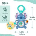 Forgassa meg a hengert a hasában, és figyelje, ahogy a színes gyöngyök örvénylenek belül – ez a mozgás, színek és hangok kombinációja serkenti a látást és a hallást! Mozgassa a gyöngyöket Stitch fogantyúján keresztül, és fejlessze közben a finommotorikát! A puha plüss kör kézzel készített babával susogó hangokat ad ki, amelyek stimulálják a tapintást és a hallást. A C-gyűrűnek köszönhetően a játék könnyen rögzíthető a babakocsira vagy az autósülésre – ideális utazáshoz vagy sétákhoz. Könnyű, kompakt és alkalmas fiúknak és lányoknak születéstől kezdve.