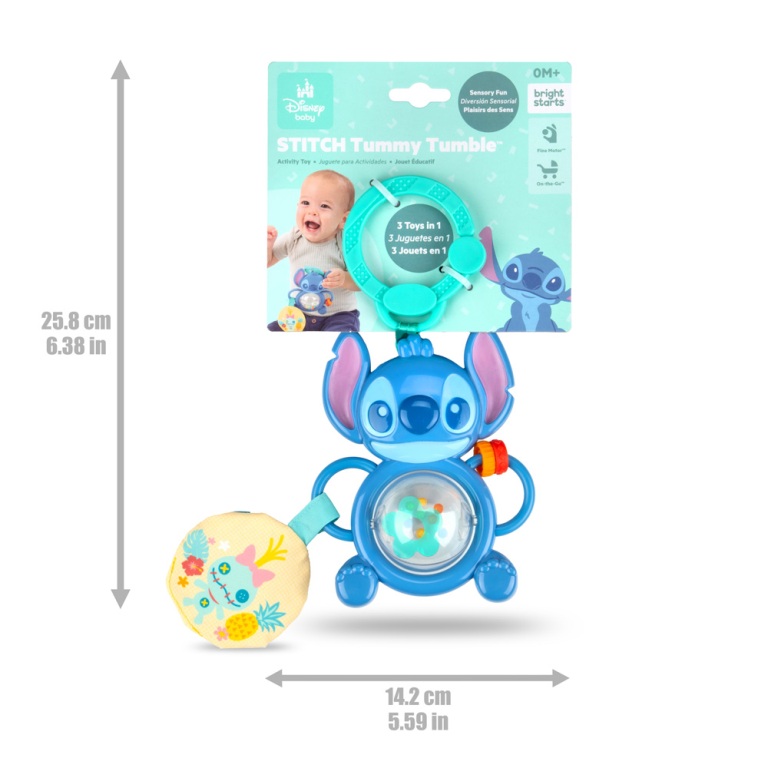 Forgassa meg a hengert a hasában, és figyelje, ahogy a színes gyöngyök örvénylenek belül – ez a mozgás, színek és hangok kombinációja serkenti a látást és a hallást! Mozgassa a gyöngyöket Stitch fogantyúján keresztül, és fejlessze közben a finommotorikát! A puha plüss kör kézzel készített babával susogó hangokat ad ki, amelyek stimulálják a tapintást és a hallást. A C-gyűrűnek köszönhetően a játék könnyen rögzíthető a babakocsira vagy az autósülésre – ideális utazáshoz vagy sétákhoz. Könnyű, kompakt és alkalmas fiúknak és lányoknak születéstől kezdve.