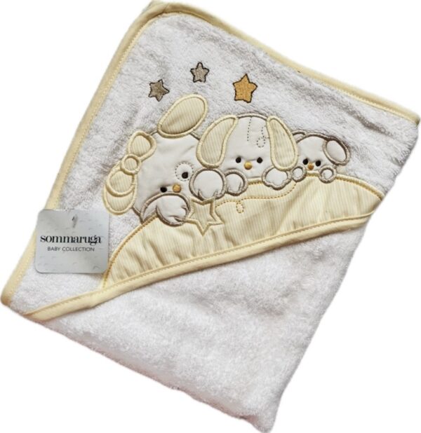 Ideális kisbabák számára, de akár nagyobb gyermekek is használhatják. A törölközőn egy kapucni található, amely megvédi a baba fejét a hidegtől. A törölköző tökéletesen felszívja a nedvességet és nagyon gyorsan szárad.