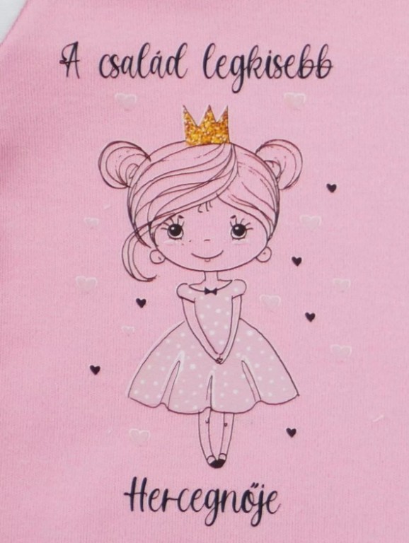 Azonnal beleszeretsz ebbe a cukin nyomott hercegnős rugdalózóba, mely tökéletes választás a kis pasik számára. A rózsaszín színű, 100% pamutanyagból készült darab végig patentos, ami megkönnyíti a peluscserét és az öltözködést, így a mindennapokban is praktikus viselet.