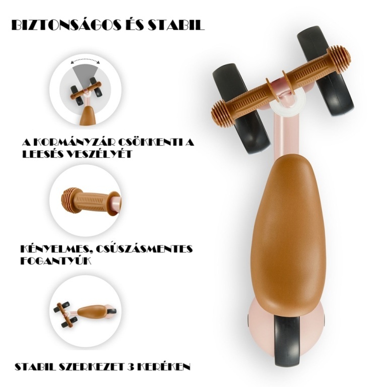 A CUTIE egy olyan mini tricikli, amely az eredeti, modern dizájn, a biztonságos konstrukció és az egyensúlyozó kerékpár és a tricikli előnyeinek kombinációja. Kifejezetten a kis felfedezők számára készült. Már 1 éves kortól alkalmas a gyermekek számára! A csúszásmentes TPR gumiból készült fogantyúk biztos fogást biztosítanak a gyermeknek, és a könnyű súly (mindössze 1,8 kg) miatt a mini kerékpár könnyen hordozható a szülők számára. A könnyű EVA habszivacs korróziógátló kerekek és az állítható ülésmagasság (26-28 cm) minden kirándulást felejthetetlenné tesz!