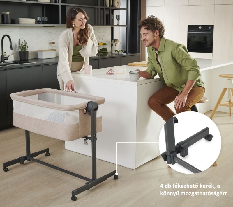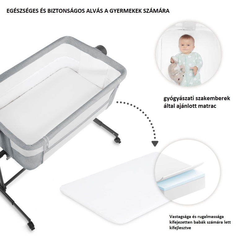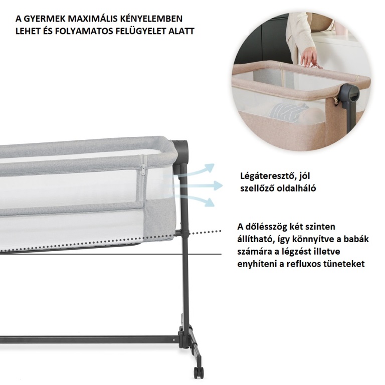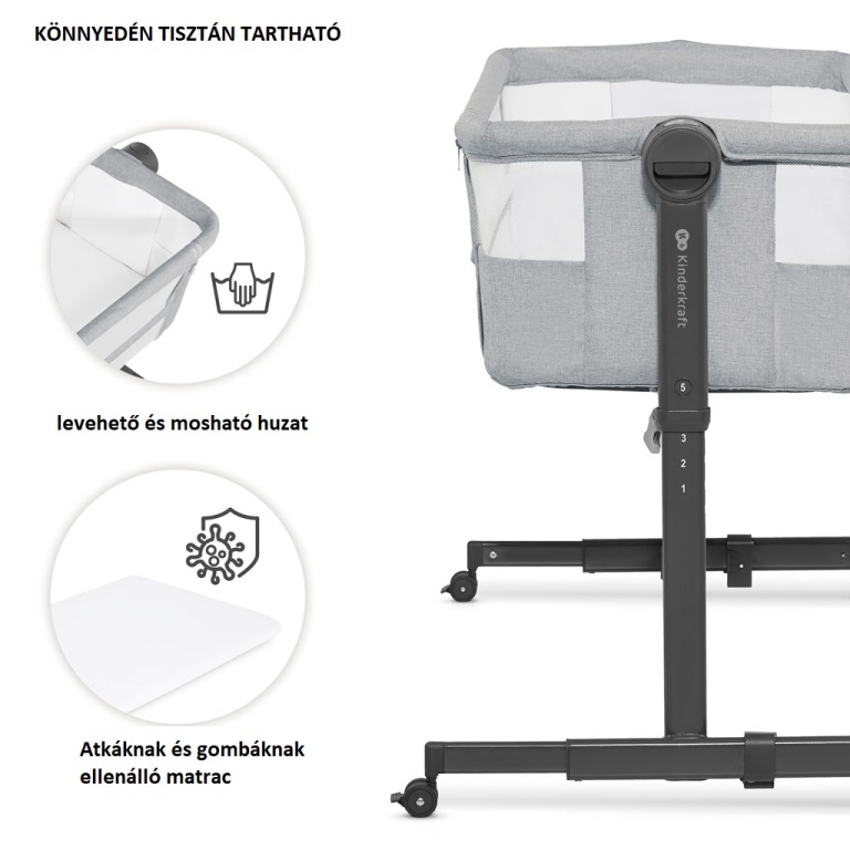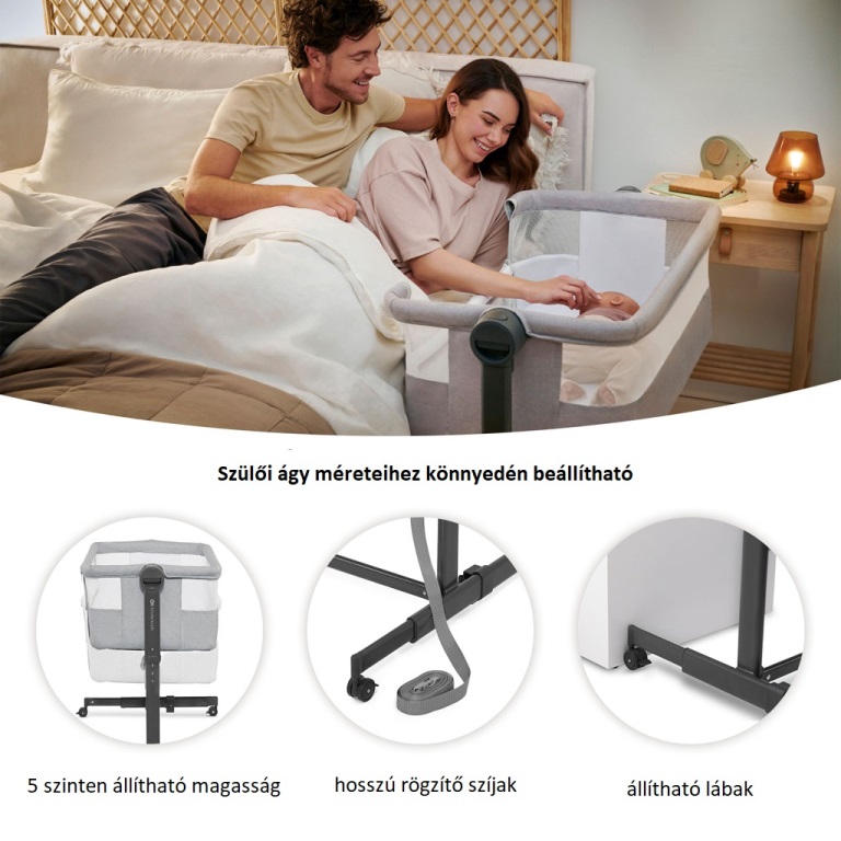 A kiságy magasságának folyamatos és könnyű beállításával a kiságybetétet egyszerűen igazíthatja a szülői ágy magasságához. Állítsa be az egyik 5 szintre, igazítsa a lábakat úgy, hogy a kiságybetét szorosan illeszkedjen az ágyhoz, és rögzítse különleges pántokkal, hogy biztonságos alvóhelyet hozzon létre gyermekének! Megőrzi a saját terét és biztosítja az alváshigiénét, miközben gyermekét kéznél tarthatja.