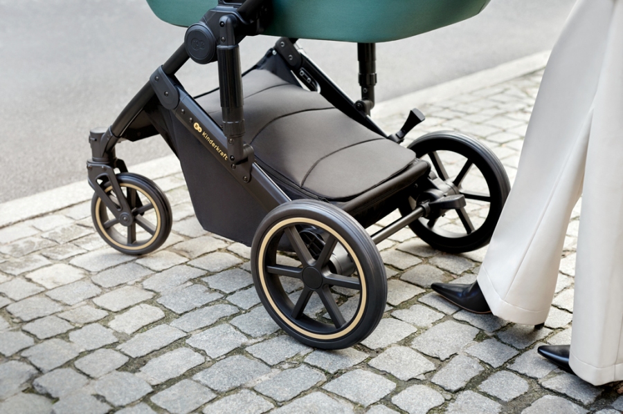 A PRIME 2 teljesen rugózott. Ez nemcsak a kerekekre, hanem a vázra is vonatkozik. A babakocsi könnyen mozgatható a járdaszegélyeken, és a nagy, kerekeknek köszönhetően nemcsak a városi járdák, hanem az erdei utak is biztonságosak lesznek a PRIME 2 számára. A habszivaccsal töltött gumikerekek biztosítják, hogy a babakocsi jól elnyelje a rázkódást, és nem kell felpumpálni a kerekeket a sétához.