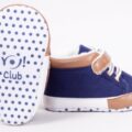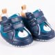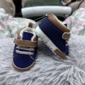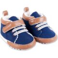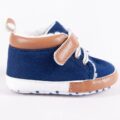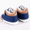Gyönyörű fiú sötétkék színű cipő, vagány barna mintával és fűzővel. Tökéletesek mindennapi sétákhoz hidegebb napokon olyan babák számára, akik még nem tudnak járni. A tépőzáras és rugalmas gumis fűzős rögzítésnek köszönhetően gyorsan felhelyezhetők és a gyermek lábához igazíthatók.