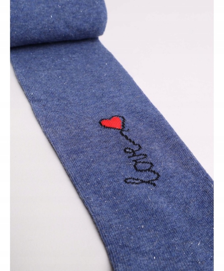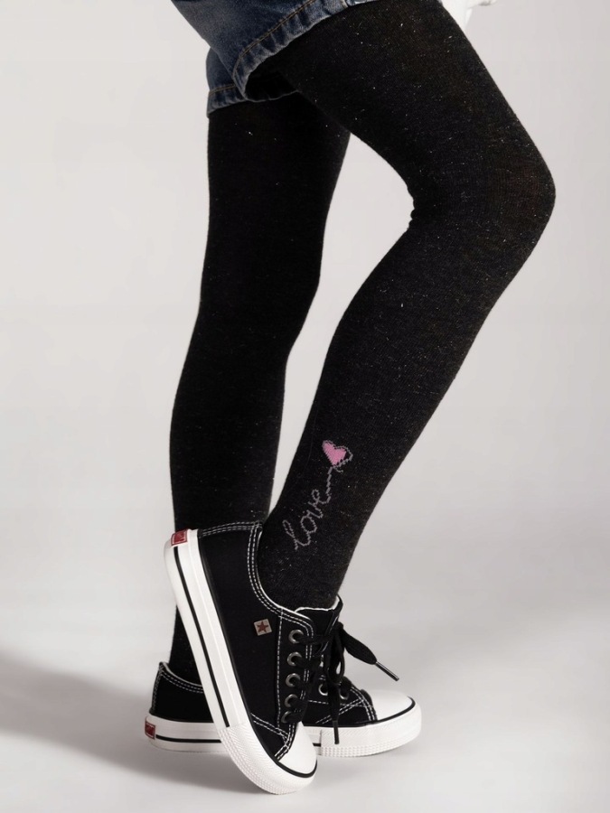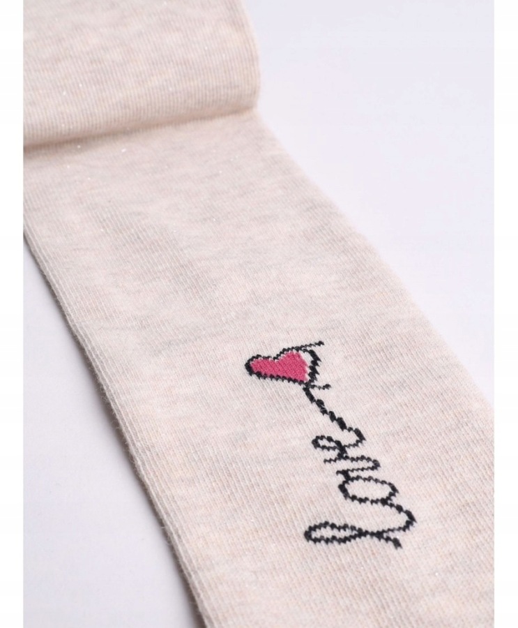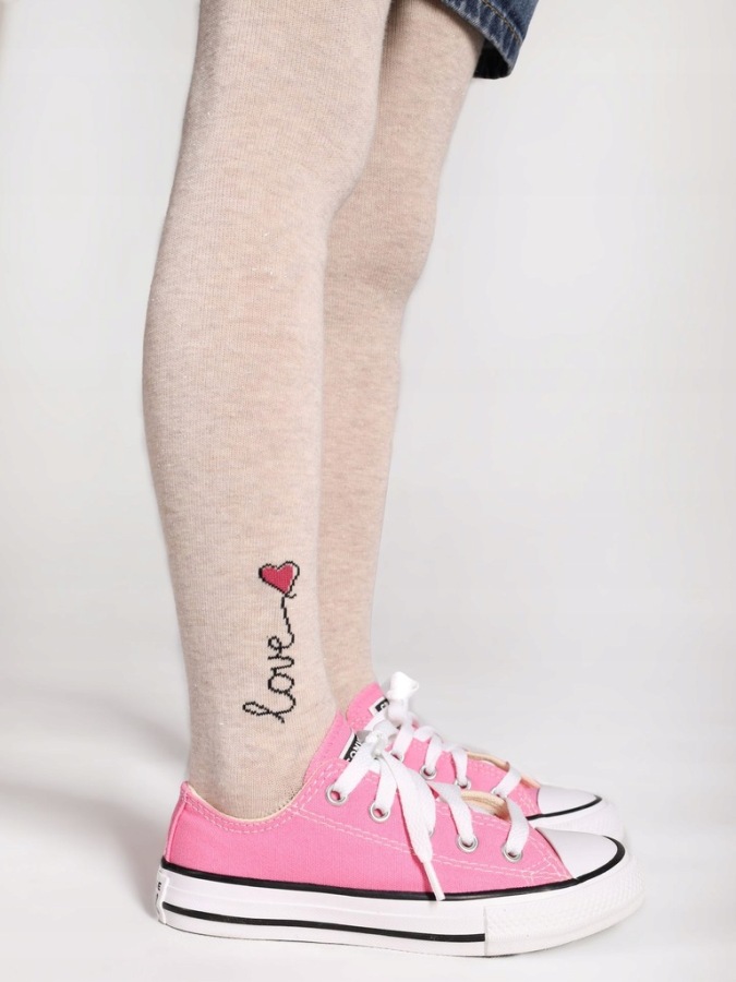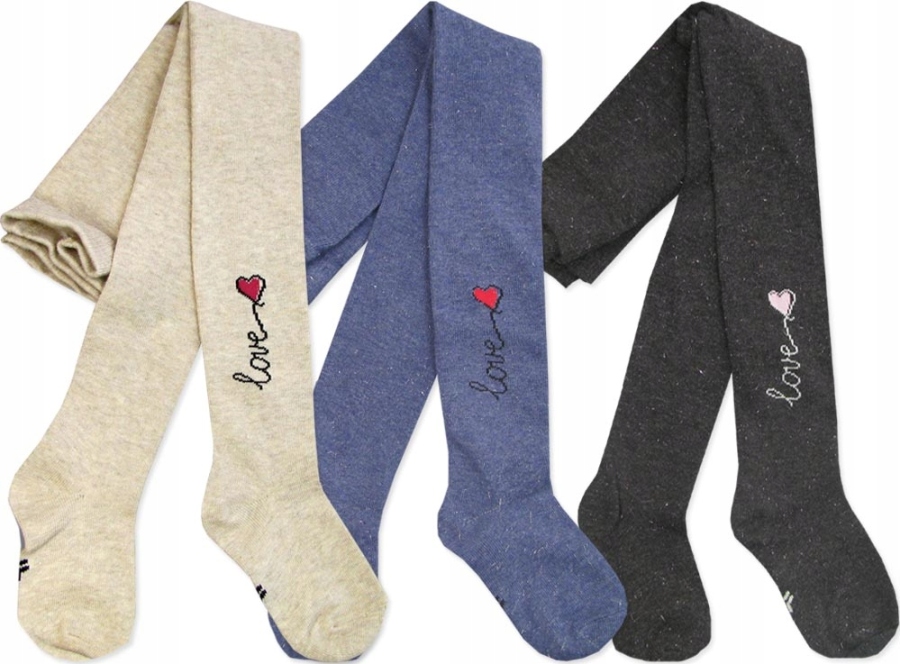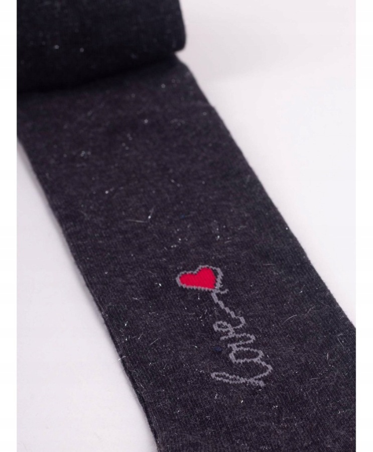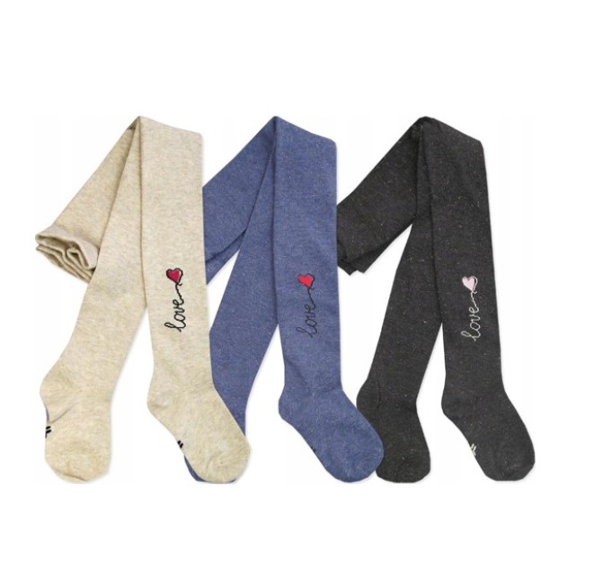 Pamut, átlátszatlan harisnyanadrág ezüst szállal és bájos mintával a szár alján, „LOVE” felirattal. Az ezüst szálnak köszönhetően gyönyörűen csillog. Puha, mégis tartós pamutból készült, így garantáltan kényelmes.
