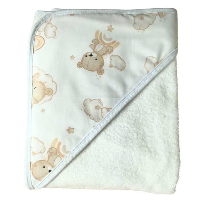 A frottír törölköző gyermekek számára praktikus kapucnival készült, hogy kényelmesen bebugyolálhassa a fürdés végén gyermekét. A törölköző kiváló nedvszívó képességgel rendelkezik és kíméletes a babák érzékeny bőréhez.