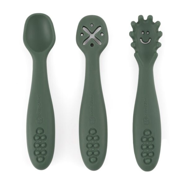 A három kanálból álló tanulókészlet lehetővé teszi, hogy a gyermek felfedezze az evés örömét. Minden kanalat úgy terveztek meg, hogy az evés élmény legyen. A készlet tartalmaz egy leveses kanalat, egy tészták könnyű megfogását lehetővé tevő kiemelkedésekkel ellátott kanalat és egy mártogatós kanalat, amely ideális joghurtokhoz vagy habokhoz. A készlet egyes kanalait finom lyukakkal látták el, amelyek lehetővé teszik az étel szabályozott adagolását. Ennek köszönhetően a gyermek megtanulhat önállóan enni, felfedezve a különböző formákat és textúrákat, ami stimulálja az érzékeit és fejleszti az érzékszervi készségeket. A szülő biztos lehet abban, hogy a baba nem nyel le egyszerre túl nagy mennyiséget.