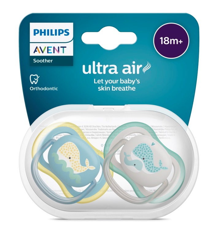 Kiszerelés: 2 db Philips Avent Ultra Air játszócumi, 1 db tároló/sterilizáló doboz