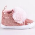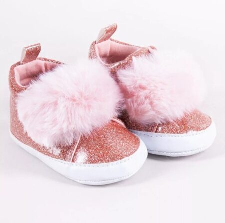 Gyönyörű kocsicipő kellemes tapintású pamut béléssel. A csatot bájos szőrme díszíti. Tökéletesek mindennapi sétákhoz hidegebb napokon olyan babák számára, akik még nem tudnak járni. A tépőzáras rögzítésnek köszönhetően gyorsan felhelyezhetők és a gyermek lábához igazíthatók.