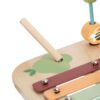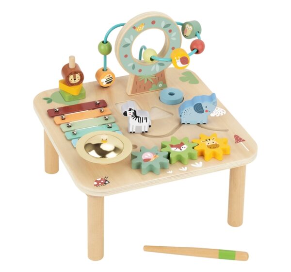 Az asztal különböző tevékenységeket tartalmaz, például labirintusokat, egy zenei központot xilofonnal, különböző formákat, amelyeket fel kell fűzni és a megfelelő helyre kell tenni, egy 3 kerekű rendszert a koordinációhoz, a felhasznált anyagok biztonságosságát tesztelték, festésük pasztell színű. Kiváló minőségű anyagokból és festékekből készült, amelyek biztonságosak a gyermekek egészsége szempontjából.