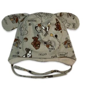 • Pamut kutyafüles megkötős, fülvédős baba sapka – Bézs kutyus