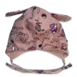 • Pamut kutyafüles megkötős, fülvédős baba sapka – Mályva kutyus