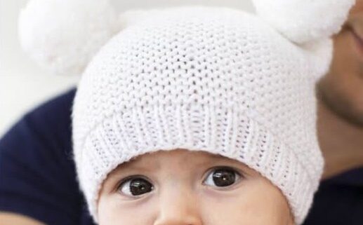 • Vastag kötött fülvédős, megkötős sapka – Fehér/rózsaszín csíkos masni (34-36 cm fejkörfogat)